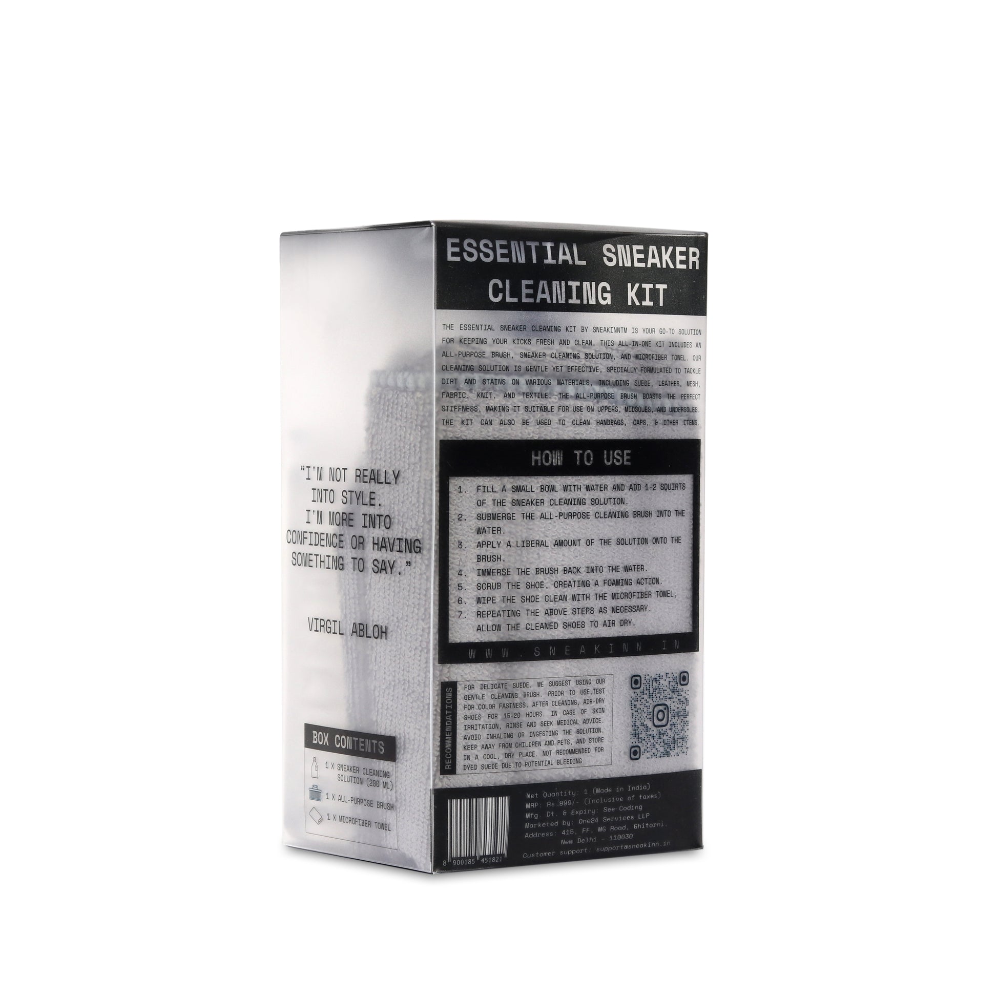 The Essentials Sneaker Cleaning Kit by SneakinnTM, your go-to solution for keeping your kicks fresh and clean. This all-in-one kit features an all-purpose brush, premium cleanse gel, and microfiber towel.